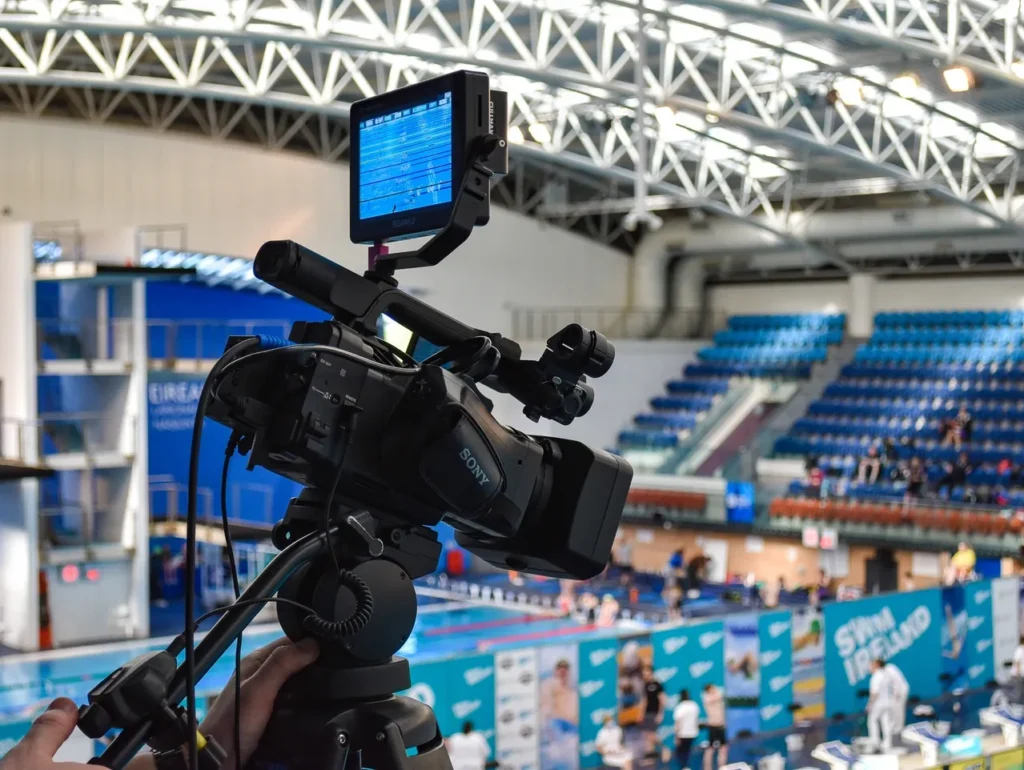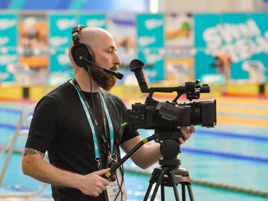 Given the length of the pool was 50 meters, a 15 meter rail was incorporated into the 4 camera production to give the viewer a smooth vertically moving view of the athletes moving across the middle of the pool allowing for an elevated camera to capture race starts and finishes.